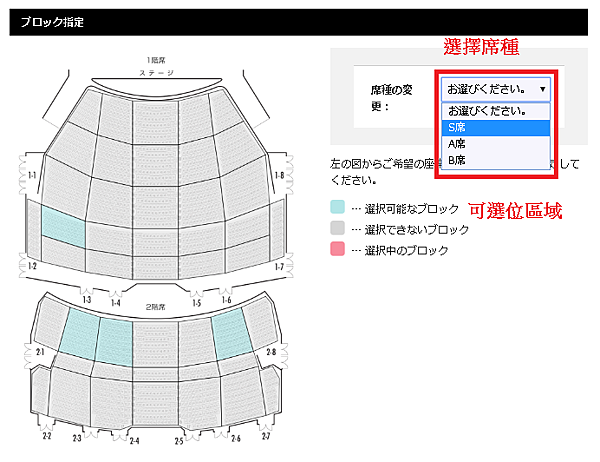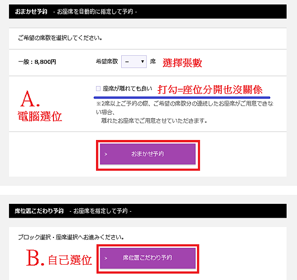 選擇 B. 自己選位 → 選擇席種 → 座位區域 → 指定座位